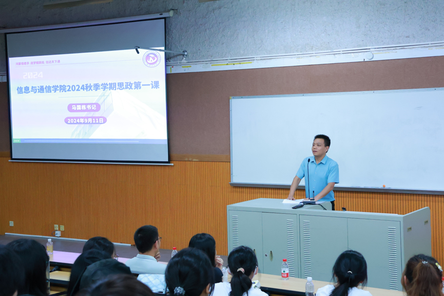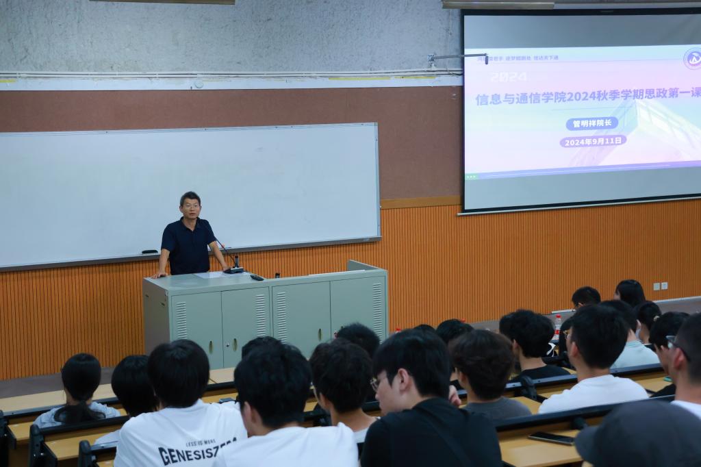 9月11日,信息与通信学院于知行楼6-101开展2024学年秋季学期“思政第一课”,学院院长管明祥、党委书记马国栋为主讲人,信息与通信学院2024级全体新生聆听讲课。